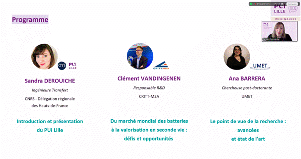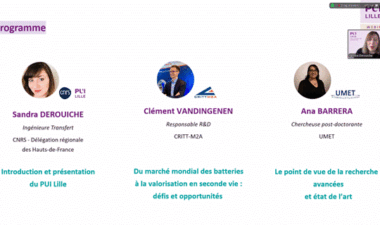 Cette présentation s’est inscrite dans une session d’échanges animée par Sandra Derouiche, Ingénieure en transfert de technologie au CNRS Hauts-de-France et Business Developer au PUI Lille. Les discussions ont également bénéficié de l’expertise académique d’Ana Luisa Barrera, chercheuse à l’Université de Lille au sein du laboratoire UMET (Unité Matériaux et Transformations), qui a présenté les verrous scientifiques et limites actuelles du recyclage des batteries.